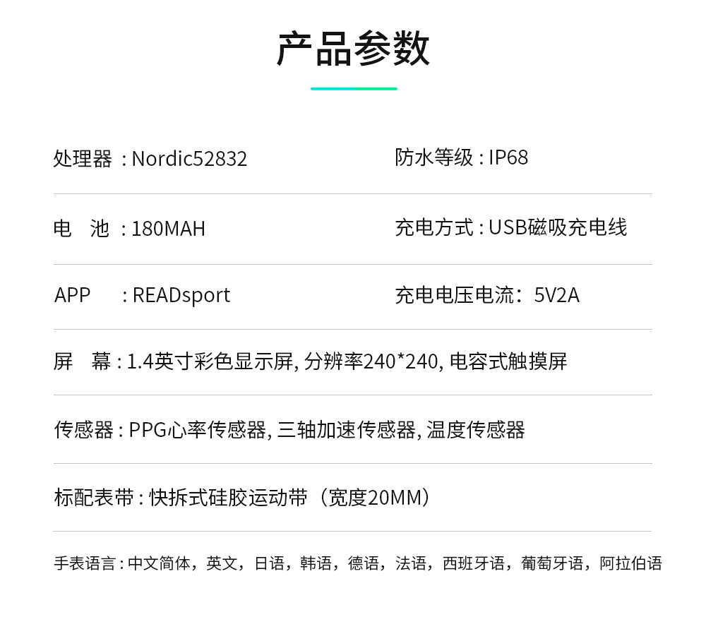 產(chǎn)品類型:智能穿戴? ? ? ? ? ? ? ? ? ? ? ? ? |? ?信息推送:支持 屏幕尺寸:1.4inch? ? ? ? ? ? ? ? ? ? ? ? ? ? |? ?來電提醒:支持 分辨率:240*240? ? ? ? ? ? ? ? ? ? ? ? ? ? ?|? ?防水:IP68 操作平臺:NRF52832? ? ? ? ? ? ? ? ? ? ? ?|? ?震動模式:支持 材質(zhì):鋅合金? ? ? ? ? ? ? ? ? ? ? ? ? ? ? ? ? ? |? ?側(cè)鍵:支持 內(nèi)存:64KB+512KB? ? ? ? ? ? ? ? ? ? ? ? ?|? ?充電器:磁鐵彈簧針 存儲:64M bit? ? ? ? ? ? ? ? ? ? ? ? ? ? ? ? ? |? ?GPS:不支持 功能介紹? ? ? ? ? ? ? ? ? ? ? ? ? ? ? ? ? ? ? ? ? ?|? ? APP:支持專門APP 藍(lán)牙:藍(lán)牙 4.0, 支持安卓和iOS系統(tǒng)? ?|? ?語言:多語言 多運(yùn)動模式:支持? ? ? ? ? ? ? ? ? ? ? ? ? ? ? |? ?手表語言:APP語言 心率測試:3300光學(xué)心率傳感器? ? ? ? |? ? 說明書語言:手表語言 體溫測試:支持? ? ? ? ? ? ? ? ? ? ? ? ? ? ? ? ?|? ? 結(jié)構(gòu)特點(diǎn) 呼吸功能:支持? ? ? ? ? ? ? ? ? ? ? ? ? ? ? ? ?|? ? 尺寸:43.25*36.25*9.5mm 節(jié)拍器:支持? ? ? ? ? ? ? ? ? ? ? ? ? ? ? ? ? ? |? ? 電池:180MA 計(jì)步器:支持? ? ? ? ? ? ? ? ? ? ? ? ? ? ? ? ? ? |? ? 顏色:玫瑰金,黑色,銀色 睡眠監(jiān)測:支持? ? ? ? ? ? ? ? ? ? ? ? ? ? ? ? ?|? ?包裝尺寸:102*83*68MM G-傳感器:支持